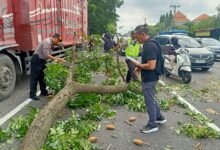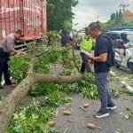 Polsek Denpasar Timur Bersama BPBD Evakuasi Truk Kontainer yang Tabrak Pohon