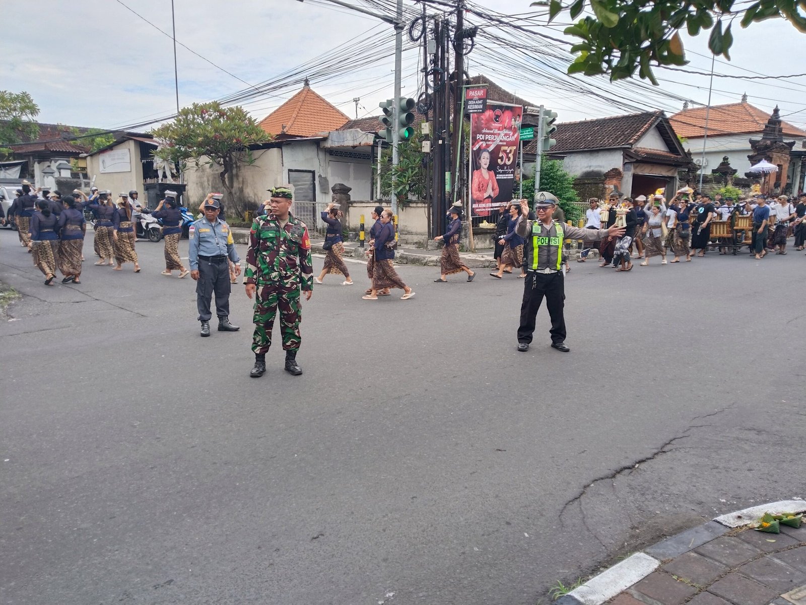 Personel Polsek Dentim bersinergi dengan unsur TNI, Linmas, dan Pecalang setempat guna memastikan kelancaran iring-iringan warga pengusung bade yang melintas di lokasi tersebut.