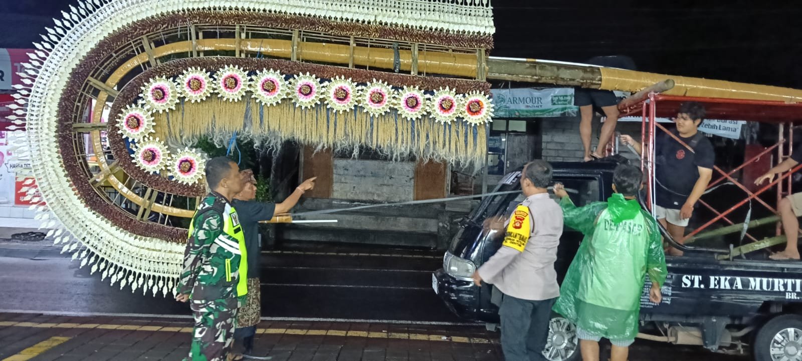 Mengingat ukuran bambu penjor yang besar dan panjang, dilakukan pengaturan arus lalu lintas secara situasional guna mengantisipasi potensi hambatan, sehingga kegiatan tetap berjalan kondusif.
