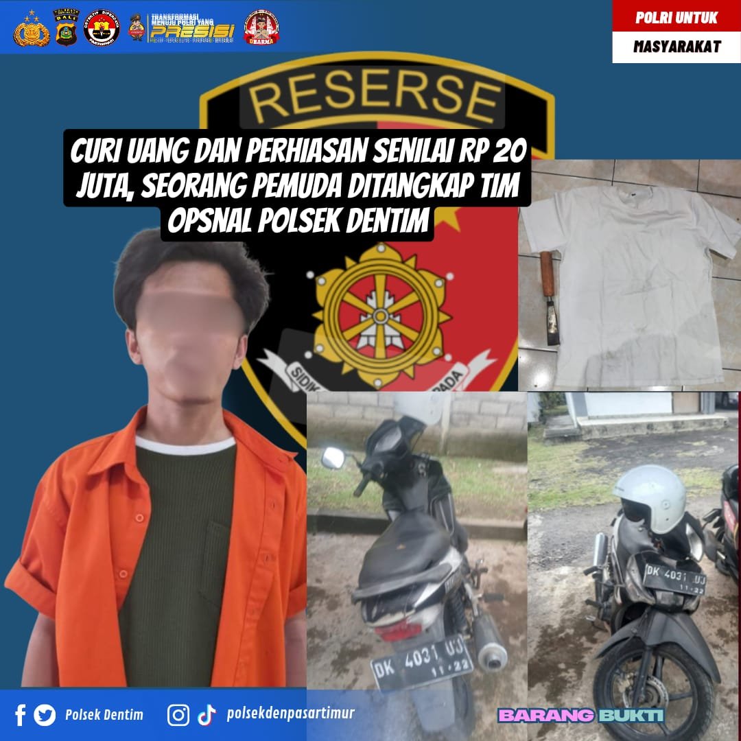 Imigrationtoday.id, Denpasar – Bali | Tim Opsnal Unit Reskrim Polsek Denpasar Timur (Dentim) berhasil mengungkap kasus pencurian yang terjadi di Jalan Siulan, Gang Sekar Buana No. 44, Banjar Buaji, Desa Penatih Dangin Puri, Denpasar Timur. Seorang pemuda berinisial IMRA (21th) diamankan setelah terbukti melakukan aksi pencurian dengan kerugian mencapai Rp 20.535.000.