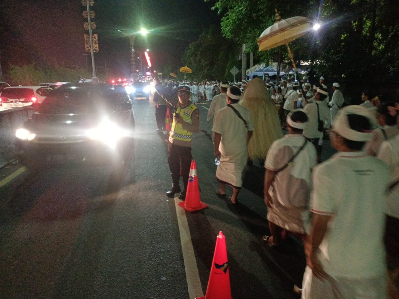 Personel gabungan melakukan pengaturan arus kendaraan, pemantauan di area pura, serta menjaga situasi tetap kondusif selama berlangsungnya prosesi upacara.