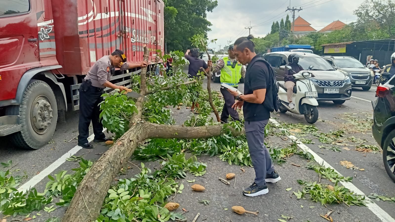 Akibat benturan tersebut, pohon tumbang dan menimpa dua unit mobil yang sedang berhenti di lampu merah serta satu unit sepeda motor. Sementara satu pengendara sepeda motor mengalami luka lecet dan nyeri pada bagian pinggang akibat tertimpa ranting pohon.