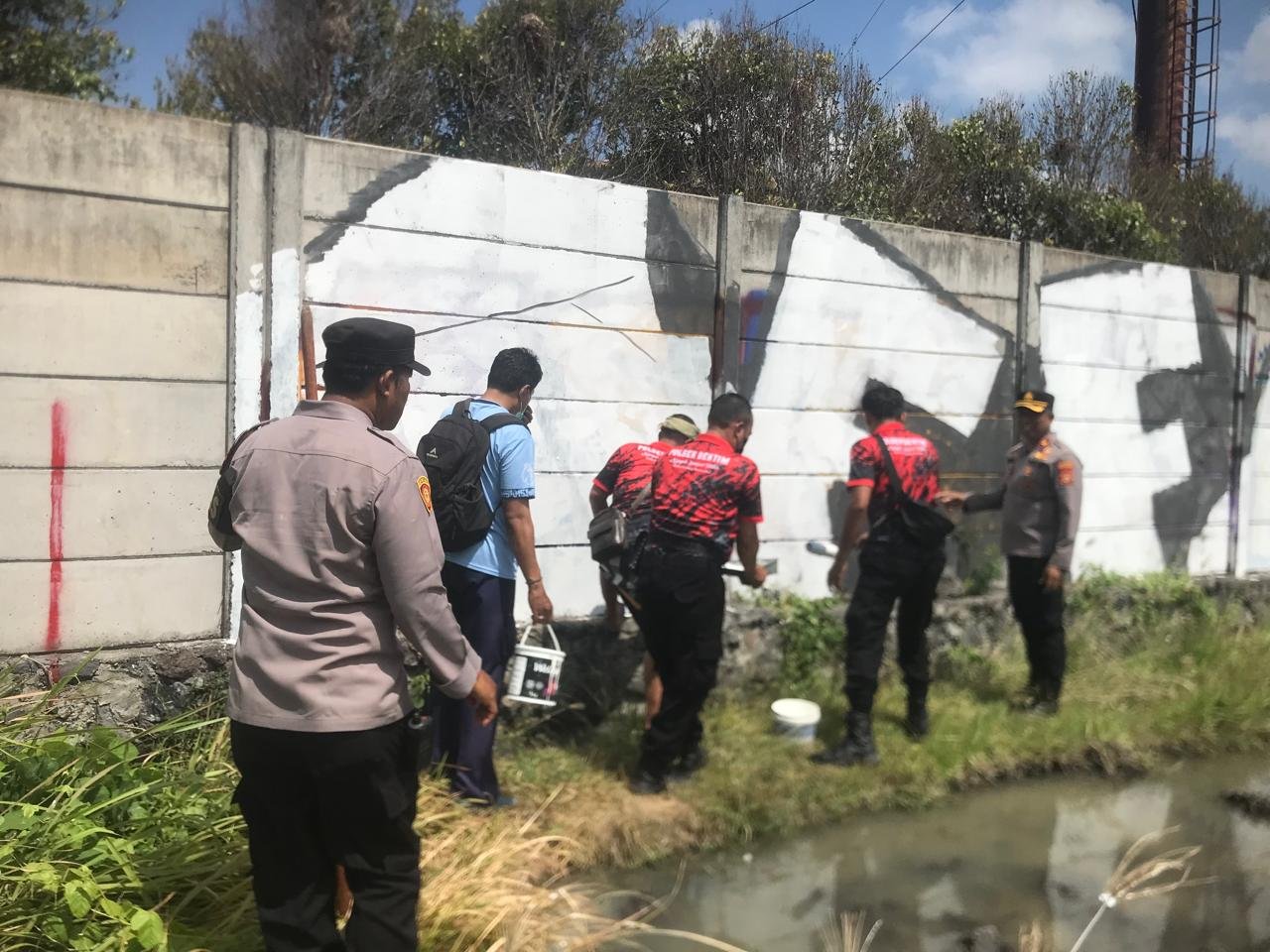 Kapolsek Dentim Kompol I Ketut Tomiyasa, S.H., M.H., bersama Kanit Binmas AKP I Nyoman Sujana, S.H., dan Kanit Intelkam Iptu I Nyoman Hendra beserta anggota Polsek Dentim turun langsung melakukan pembersihan dengan mengecat ulang tembok yang tercoret.