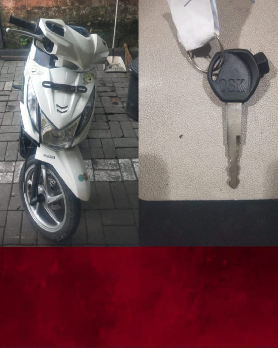 Barang bukti yang diamankan berupa satu unit sepeda motor Honda Beat warna putih dengan nomor polisi DK 4856 DU serta satu buah kunci palsu yang diduga digunakan saat melakukan aksi pencurian.